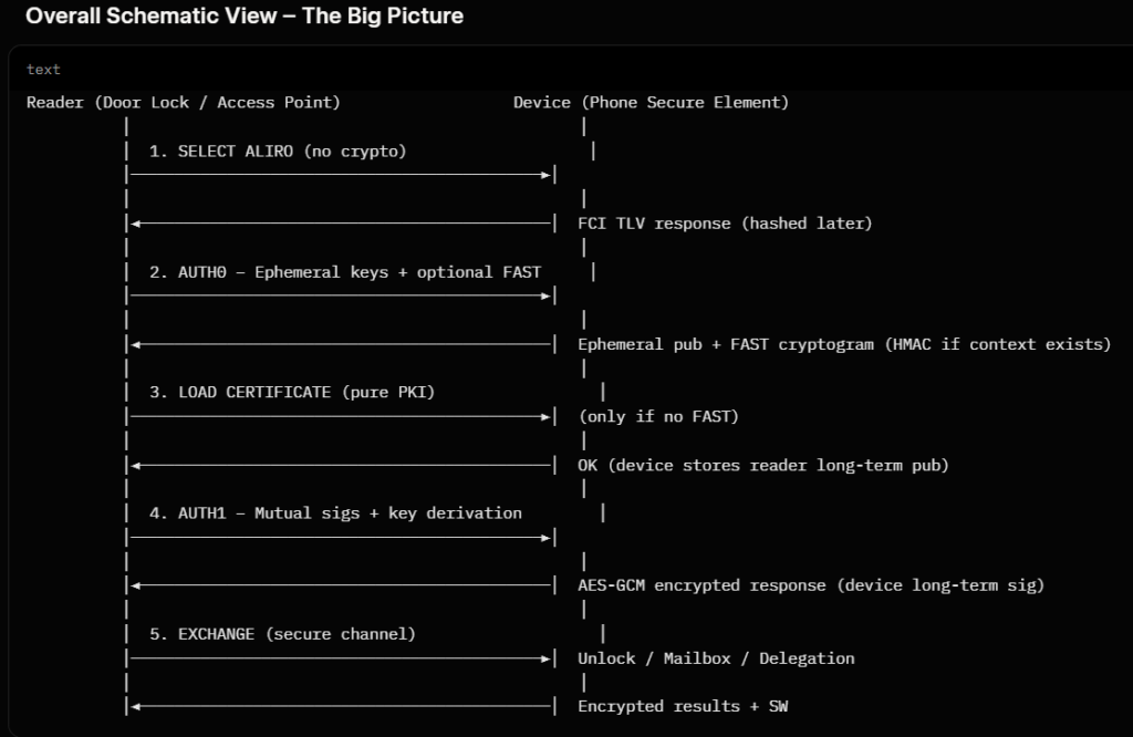 For Aliro, the practical view is lower-level because it’s an NFC/BLE protocol (APDUs), but the research repo at github.com/kormax/aliro shows the exact commands you would see when implementing a reader or wallet integration. The most certificate-focused one is LOAD CERTIFICATE: